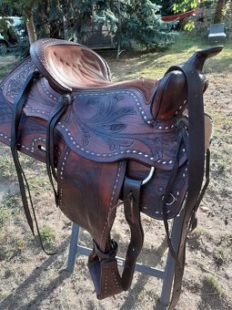 Prodám westernové sedlo s veškerým vybavením. Sedlo se všemi řemeny, podsedlovkou, podbřišníkem a kožené brašny k sedlu. Sedlo i brašny jsou s vyřezávaným zdobením. Je používané, ale ve velmi dobrém stavu. Všechny řemeny, podsedlovka i podbřišník jsou nové. Měla jsem ho na Noričku. Komplet vše za 21000 kč.
