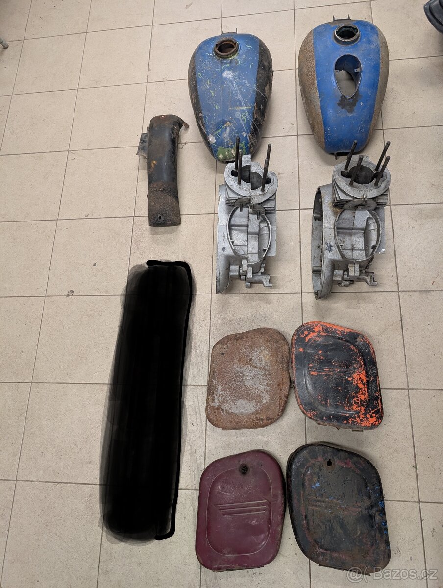 Cena: V textu. Nabízím díly pravděpodobně Jawa kývačka Jawa 353 Jawa 250 Jawa 354 Jawa 350 pérák půlbuben. Nádrž s ampérmetrem vnitřek viz foto 1000.- Nádrž bez ampérmetru 250.- Bloky párové značení 347 zachovalé do sedací plochy 1800.- Bloky párové značení 416 horší do sedací plochy 800.- Pod blatník 400.- Kastlíky dva páry tedy čtyři kusy 500.-