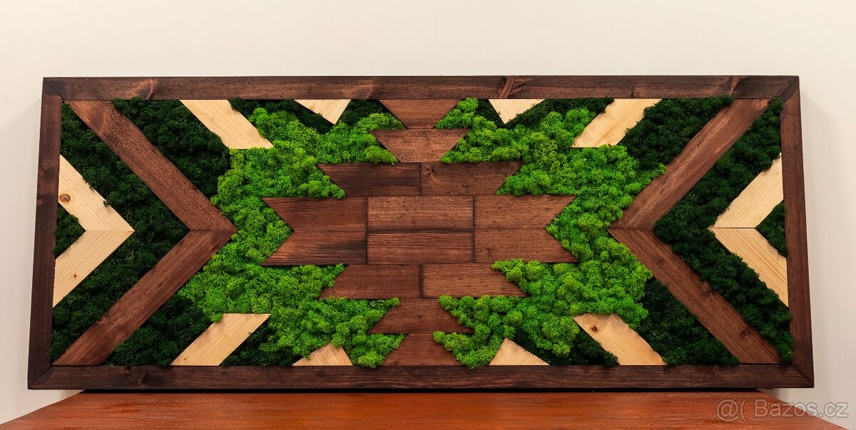 Mechový obraz 122x50cm. Jedná se o živý stabilizovaný mech - lišejník. Vybral jsem 2 varianty a to Finský - Borovicová zelená, a jablkově zelen. Rám je z recyklovaného dřeva, namořen a lakován. Něco o mechu - lišejníku: Jelikož lišejník pochází z lesa, může obsahovat jehličí a jiný drobný přírodní materiál. Stabilizovaný lišejník pochází ze Skandinávie a podléhá regulovanému ekologickému sběru s ohledem na ochranu životního prostředí. Stabilizované mechy jsou 100% přírodní produkt. Díky stabilizaci si zachovávají svoji barevnost a pružnost po několik let. Jsou vhodné pouze pro dekorativní účely, ideální pouze v interiéru. Nevyžadují žádnou speciální údržbu, zalévání, stříhání nebo osvětlení. O tento obraz se nemusíte nijak starat a oživý a to doslova Váš domov, či kancelář. Na živo je tento obraz ještě hezčí ????. Pouze osobní odběr, popř, poštovné 350Kč.