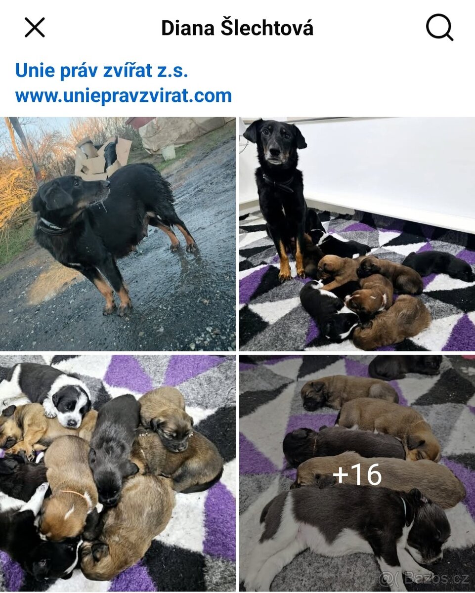 Cena: Dohodou. Unie práv zvířat z.s., Diana Šlechtová - nabízí k adopci 8mi týdenní vymazlená štěňátka. Fenka zachráněna z ulice ve vysokém stádiu březosti. Štěňata jsou očkovaná, odčervená, čipovaná, zvyklá na děti a velké psy. Adopční smlouva, adopční poplatek.