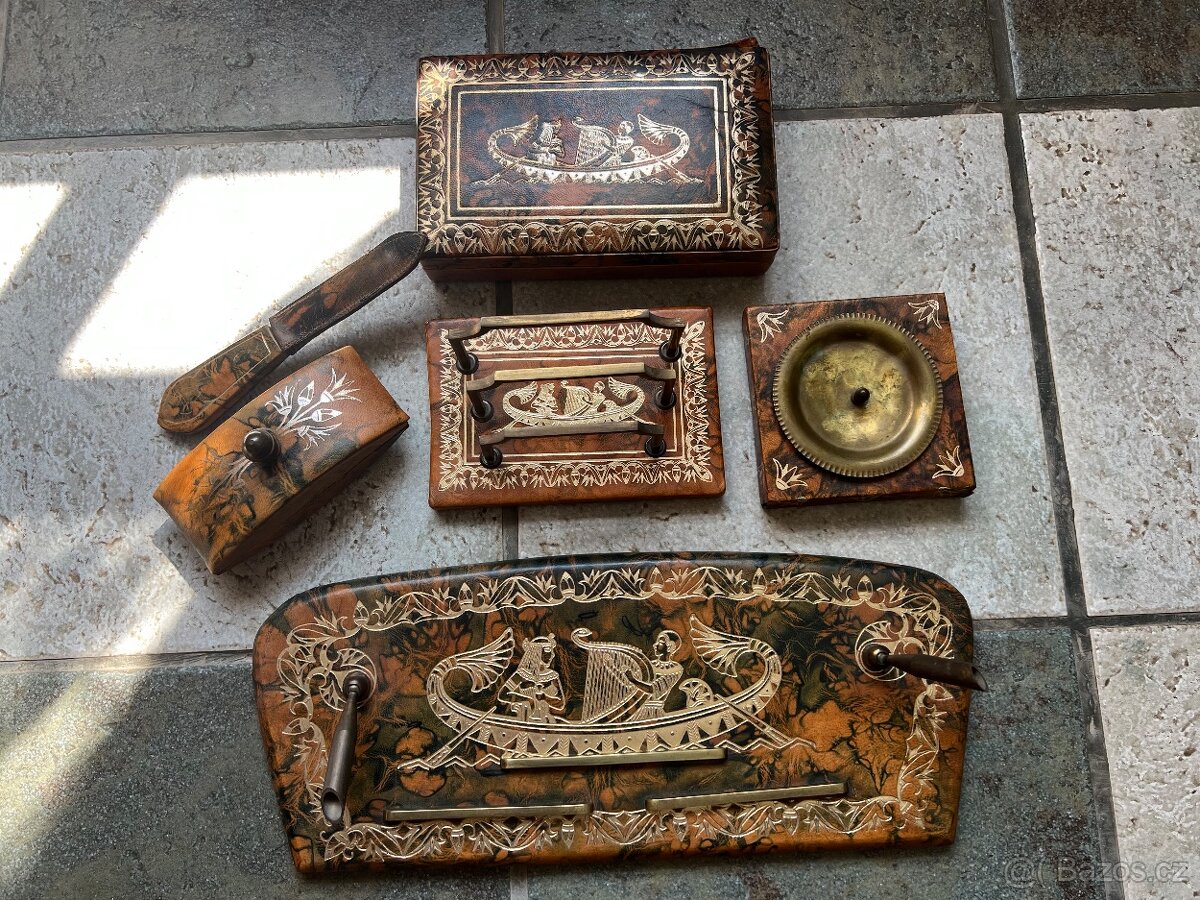 Prodám luxusní kožený kancelářský set, stáří cca 40 let velmi pěkný a zachovalý, ještě navíc složka velikosti A4, není na foto, také kožená. Cena 2400,- nebo nabídněte, dohoda jistá.