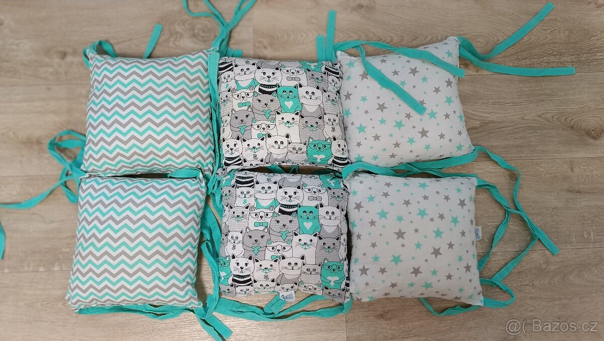 Celkem 6 ks polštářků cca 30x30 cm k navázání do postýlky. Později byly chvíli ve větší posteli (poslední foto). Vyprané. Barva min a šedá, motiv kočiček