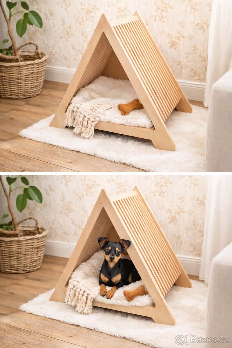 Prodám novou psí boudu do interiéru ve tvaru domečku (A-frame design). Materiál: kvalitní překližka buk Uvedené rozměry boudy jsou vnitřní. • Výška: 40 cm • Šířka: 38 cm • Hloubka: 37 cm