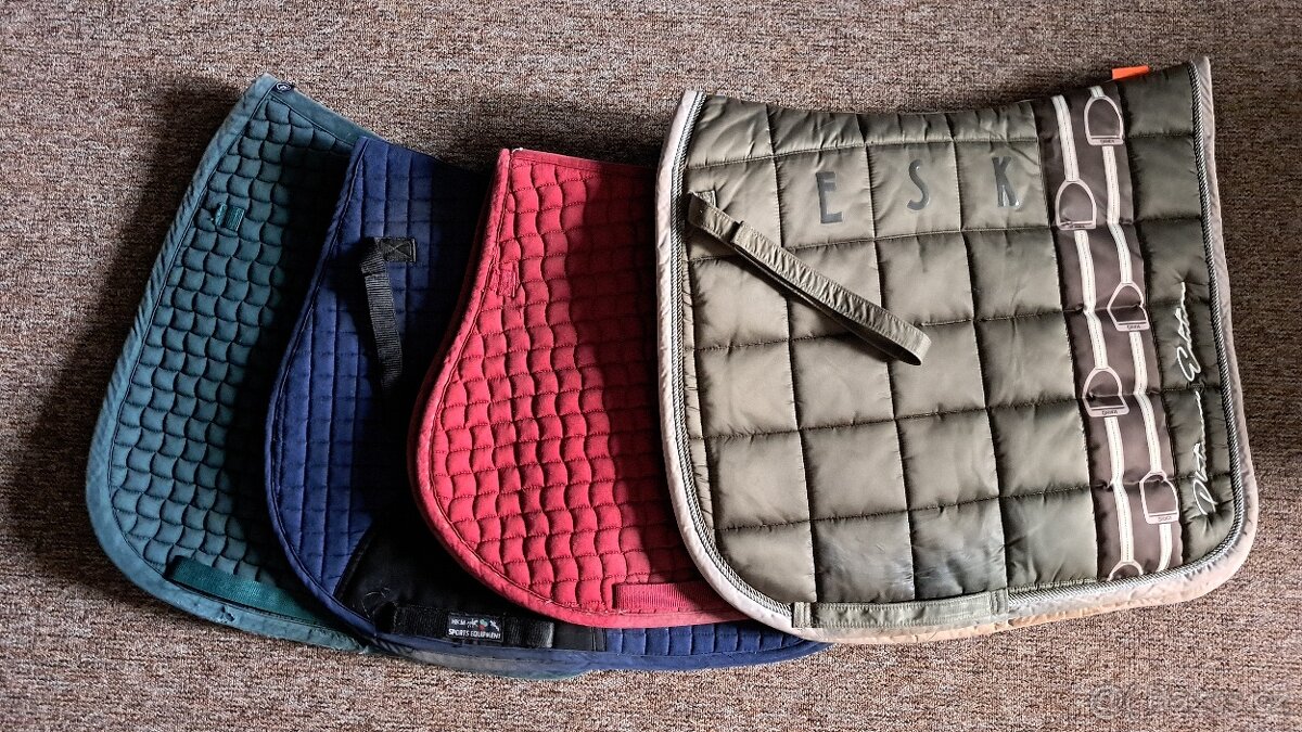 Drezurní tmavě zelená cotton eskadron starší (ošoupání kolem poutka na podbřišník, lehce vyšisovaná barva) - 150kč Skoková tmavě červená eskadron cotton starší (vytuněná od předchozího majitele paspulkou, pyramidkama. Ošoupání u poutka na podbřišník) -150kč Všestranná equiservis (bez vad, běžné opotřebení) - 150kč Drezurní eskadron platinum barva Martini olive (bez vad, max místy tmavší od sedla) - 700kč Na fotkách nevyprané, odesílám po vyprání.