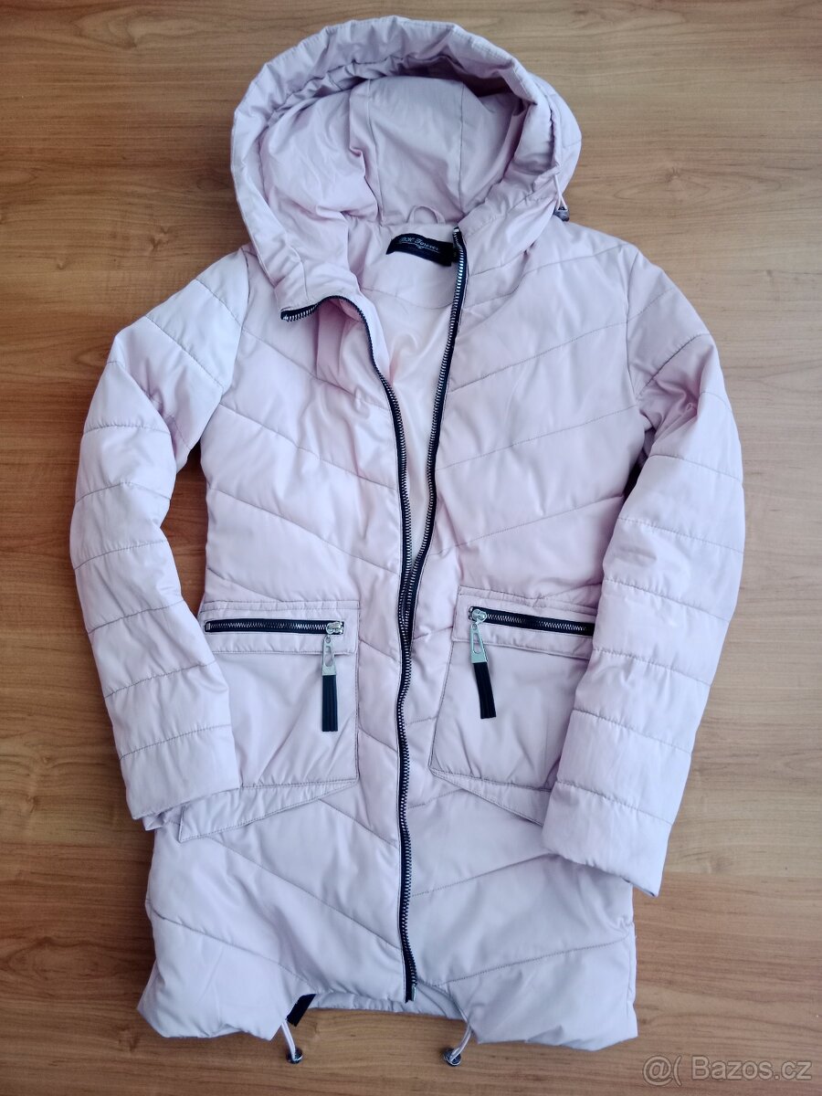 Dámská světle růžová bunda s výraznými zipy. Delší, pod zadek. Vel. S. Nošená.