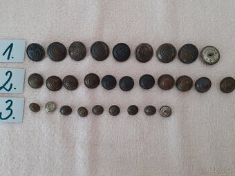 Cena: V textu. Staré vojenské knoflíky z uniformy: 1/ velikost - průměr 24 mm, celkem 9 kusů, cena za kus 50,- Kč 2/ velikost - průměr 20 mm, celkem 13 kusů, cena za kus 40,- Kč 3/ velikost - průměr 15 mm, celkem 9 kusů, cena za kus 30,- Kč. I jednotlivě.