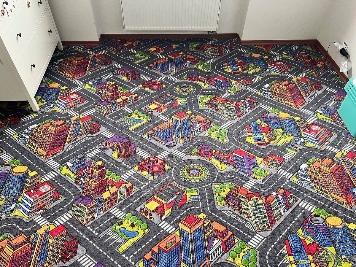 Prodám dětský koberec města. Rozměry Délka: 428 cm Šířka: 326 cm Rozměry jsou při pohledu na koberec ze správné strany.