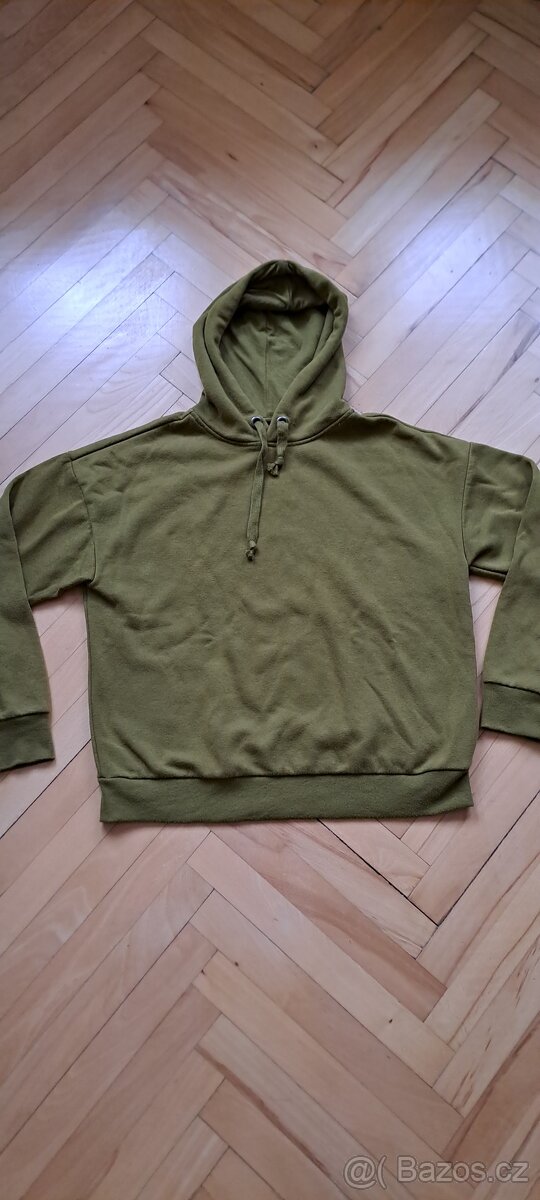 Khaki mikina s kapucí, velikost M, má žmolky od praní.