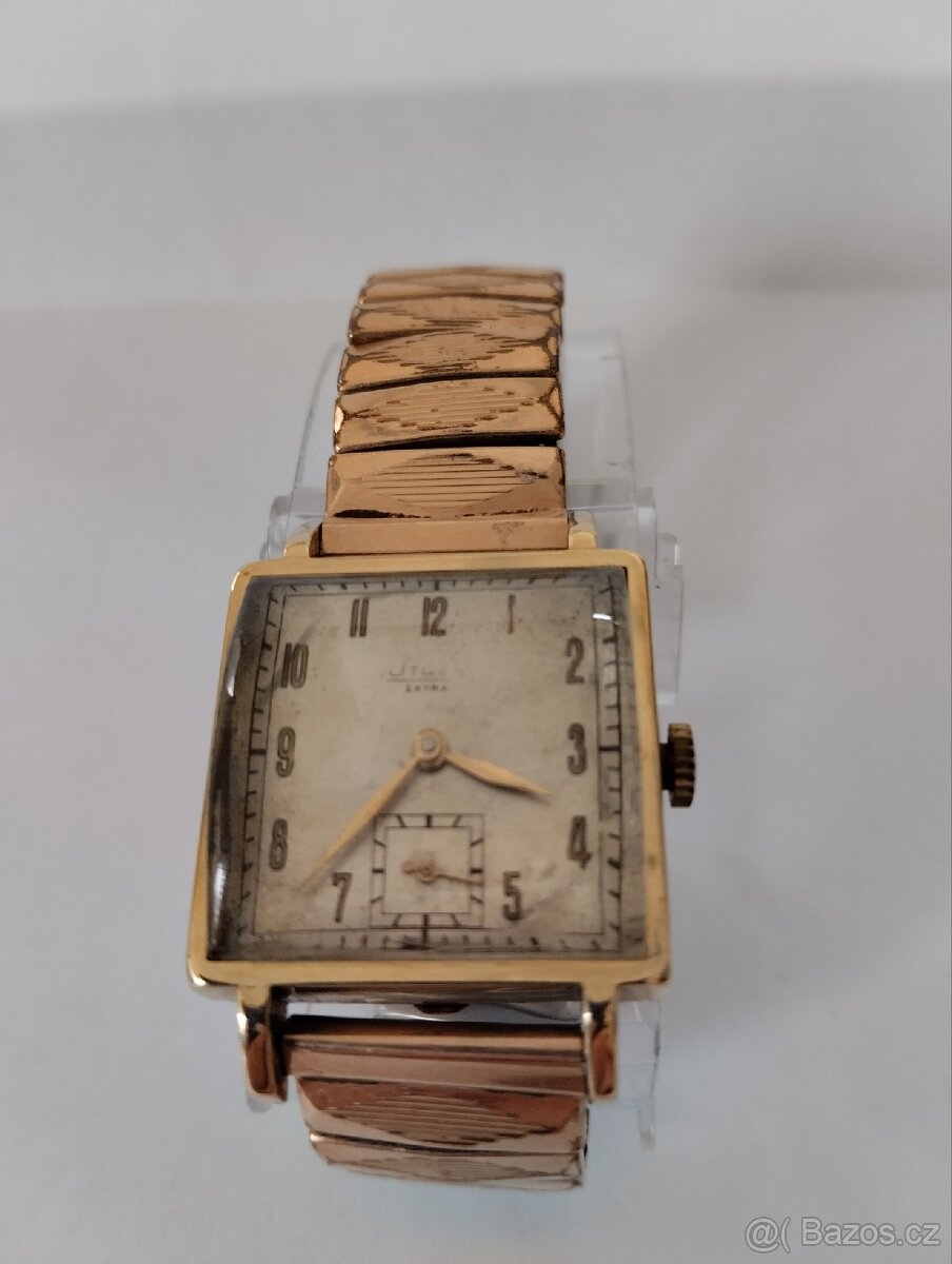 Po vyjmutí strojku obsahují 12.70g zlata, puncováno lirou,14k,585/1000, rozměr 2.5x2.5cm, přibližný rok výroby 1930 - 1940,vyrobeno v Německu,jsou po servisu od certifikovaného hodináře, plně funkční, řemínek zlatý není