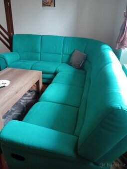 Nabízím k prodeji prostornou a velmi pohodlnou rohovou sedací soupravu v moderní smaragdově-tyrkysové barvě. Sedačka je výrazným designovým prvkem a díky svému tvaru krásně zaplní roh místnosti. Je ideální pro rodinu i pro ty, kdo si chtějí dopřát maximální pohodlí při sledování televize nebo odpočinku. Hlavní přednosti: 2× manuální výsuvná relaxační podnožka (recliner) Vysoké pohodlné opěrky zad hluboké a komfortní sezení pevná stabilní konstrukce příjemný hebký potah výrazná moderní barva – luxusní vzhled Sedačka není rozkládací na spaní (nejedná se o lůžko). Orientační rozměry: Delší strana: cca 280–300 cm Kratší strana: cca 220–240 cm Hloubka: cca 90–95 cm Výška: cca 100 cm (rozměry lze upřesnit po přeměření) Stav: Velmi zachovalá, čistá, bez poškození. Pouze běžné známky používání. Z nekuřácké domácnosti. Cena: 9900 Kč Při rychlém a slušném jednání možná dohoda na cestu sleva 500kč Pouze osobní odběr. Sedací souprava se dá kombinovat na různé délky male velke L