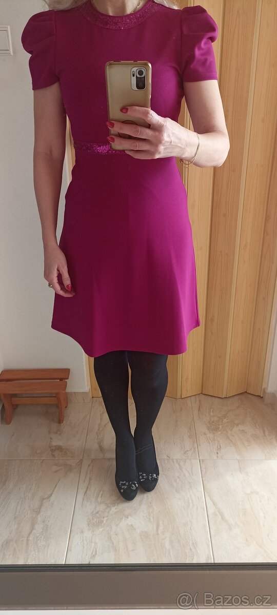 Nabízím šaty krásné fialovo růžové barvy, z krku a v pase ozdobná paspule s pajetkami. Vzaté jednou na sebe. Střih do A.