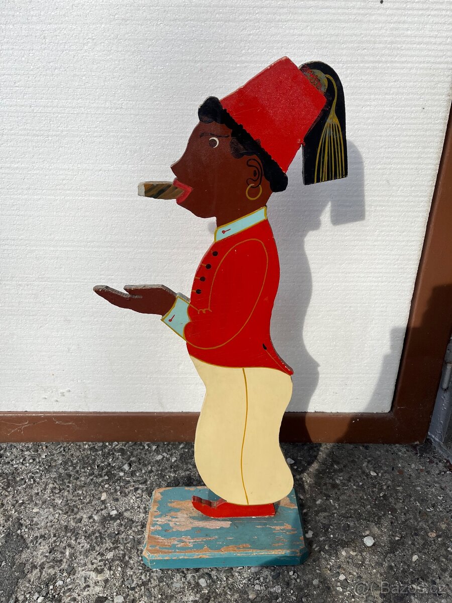 Prodám starou dřevěnou postavu. Je to plochá dřevěná silueta na podstavci. Pravděpodobně držela původně tác nebo popelník, ale to nemám k dispozici. Původ přesně nevím.