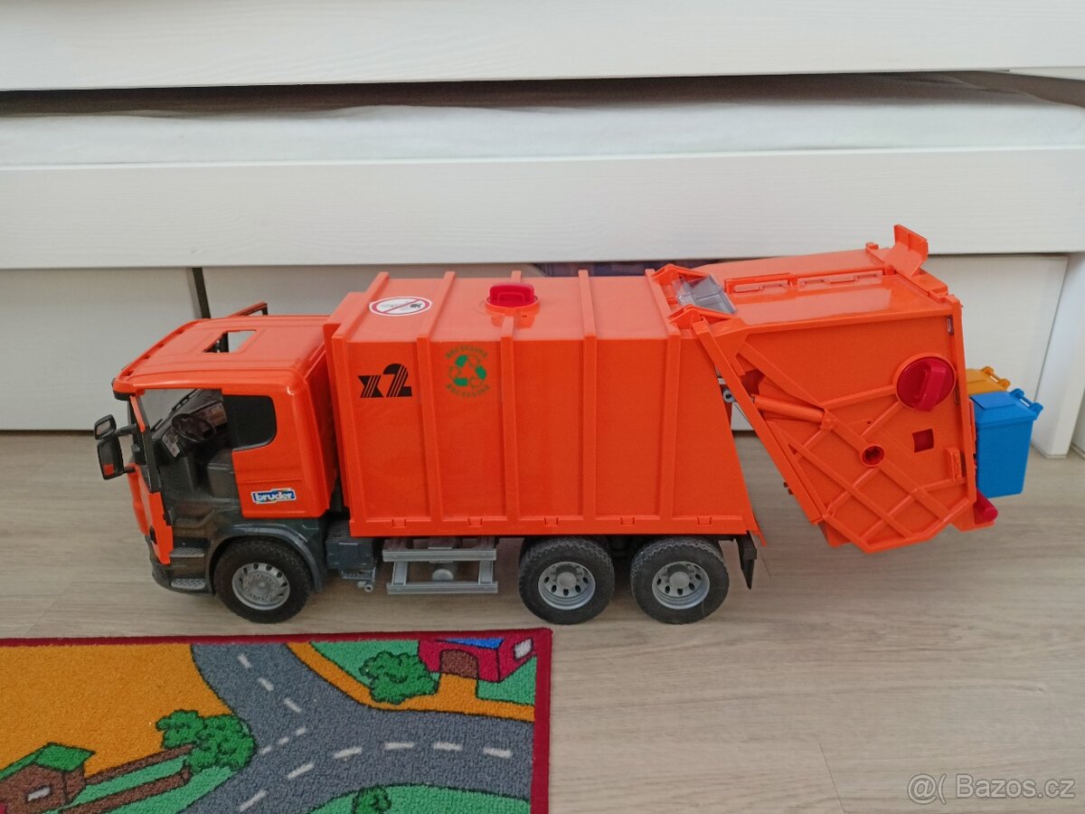 Prodám obrovské popelářské auto Bruder tak, jak je vyfoceno. Na horní kapotě asi chybí krytka ( možná tam ani nebyla - nevím) a chybí jeden červeny hak na popelnici - popelnici je možné vozit a vyklápět i bez háku a to přímo na autě (viz foto ). Jinak nevim - už si nepamatuji. Auto je málo hrane a udělá určitě ještě radost.