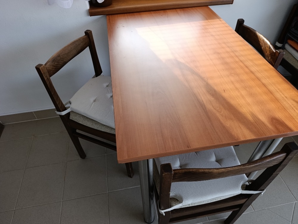 Prodáme menší stůl + 4 židle viz foto, bez poškození, rozměry 126 x 70 x výška 86 cm, cena za komplet stůl + 4ks židlí
