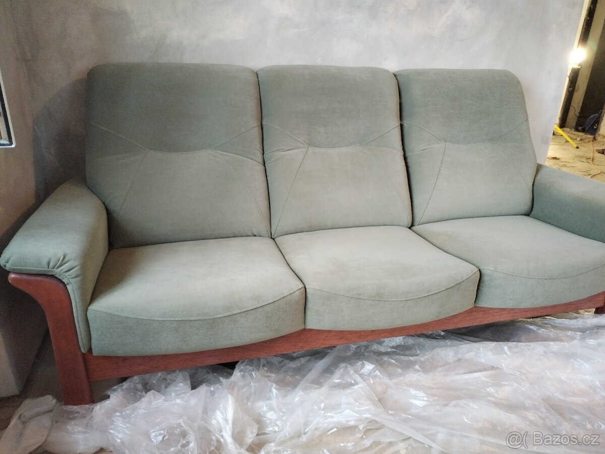 Zelená pohovka o rozměrech v 100 cm X š 215 cm. Výška sedu je 45 cm.