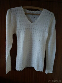 bílý ručně pletený z jemné nekousavé příze s háčkovanými ozdobnými lemy. Detail 3. foto. Celková délka 70 cm, rukáv od ramene 76 cm, přes prsa 2 x 45 cm. Málo nošený, pěkný. Cena + poštovné.