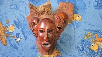 Krasna Africka rucne delana maska, osobne dovezena rodici pred cca 30 lety z Afriky. Maska ma chranit pred zlymi duchy. Velikost 46x40cm a vaha 4kg. Da se povesit na zed.