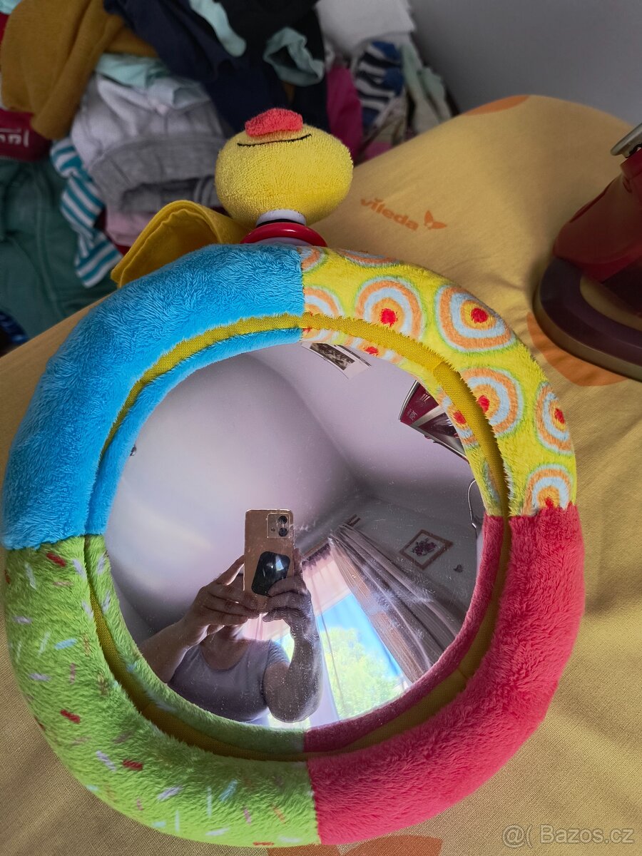 Zrcátko do auta pro kontrolu dítěte sedícího ve vajíčku nebo sedačce proti směru jízdy. Zrcadlo se připevňuje na suchý zip za podhlavnik sedadla dítěte. Zrcátko má drobné oděrky z používání, ale na další fungování to nemá vliv. Hlavička nahoře chrastí.
