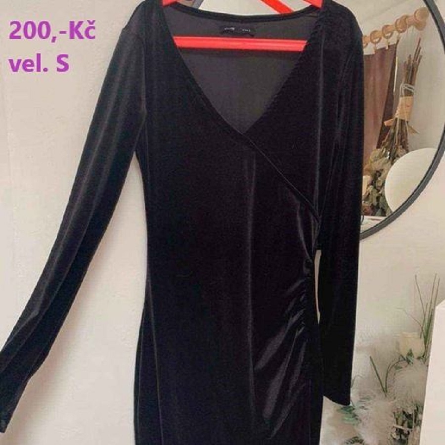 obr. 1 Sinsay - jako nové, Černé semišové šaty s dlouhým rukávem, výstřih do V, na boku nabírání, styl překřížení, Velikost S obr. 2 Veromoda - nové s visačkou, Zavazovací saténové šaty, velikost S obr. 3 Takko - jako nové, Mini černé šaty, Velikost Xs,vzadu na zip,Výstřih do V obr. 4 Tally Weijl - jako nové, velikost S