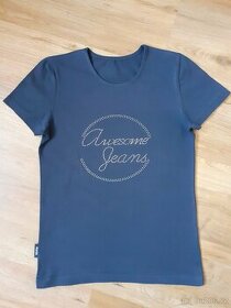Dívčí tričko s krátkým rukávem v tmavě modré barvě je poseto kamínky do moderního nápisu. Materiál je mírně elastický, hezky drží tvar. Český výrobce Betty Mode. Vel. 158, délka 58cm, výborný stav. Cena 150 Kč.