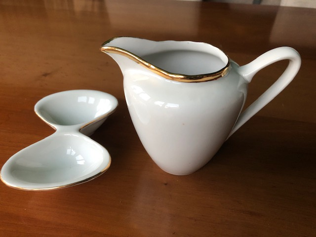Starožitná porcelánová sada mléčenka a slánka/pepřenka se zlatou linkou