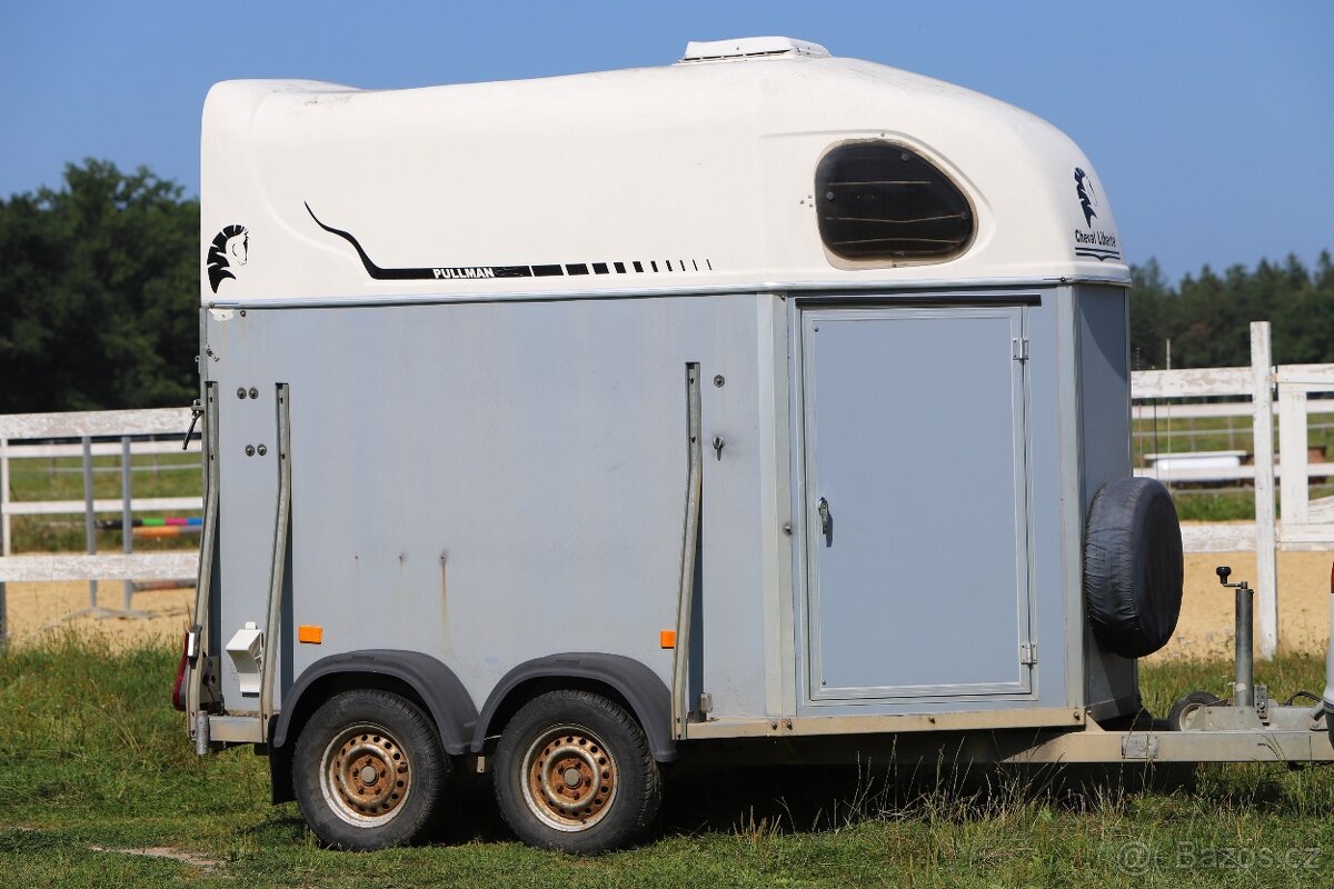 Nabízím přepravník na dva koně značky Cheval Liberté. Má HLINÍKOVOU podlahu pod koňmi, zánovní pneu, sedlovnu, samonavíjecí síťovanou roletku, automatické podpěrné kolečko, stupínek pro snadné nahlédnutí dovnitř, okopové desky, očko na síť na seno, 2 žlaby, rezervní kolo, polstrování na stěnách. Vnitřní stání lze nastavit výškově i šířkově - pro velké koně i pony, Podvozek je odpružený pro komfort koní, rampu lze otevřít i do boku, na podlaze zesílená skládaná guma. Celková hmotnost 2000kg, provozní 690kg. Ihned k odvozu, přepis přes plnou moc.