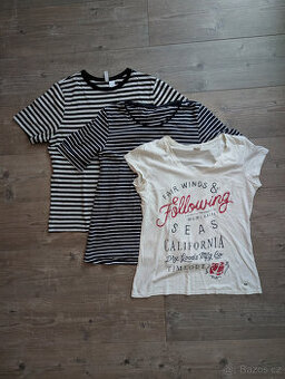 - set dámských triček 3ks - tričko pruhované - H&M - vel. M - tričko pruhované - Esmara - vel. M - tričko s potiskem - Timeout - vel. L - cena za vše - velmi dobrý stav, bez vad Odesílám přes Zásilkovnu nebo Balíkovnu (v ceně není zahrnuto poštovné). Na telefonní číslo prosím NEVOLAT, děkuji.