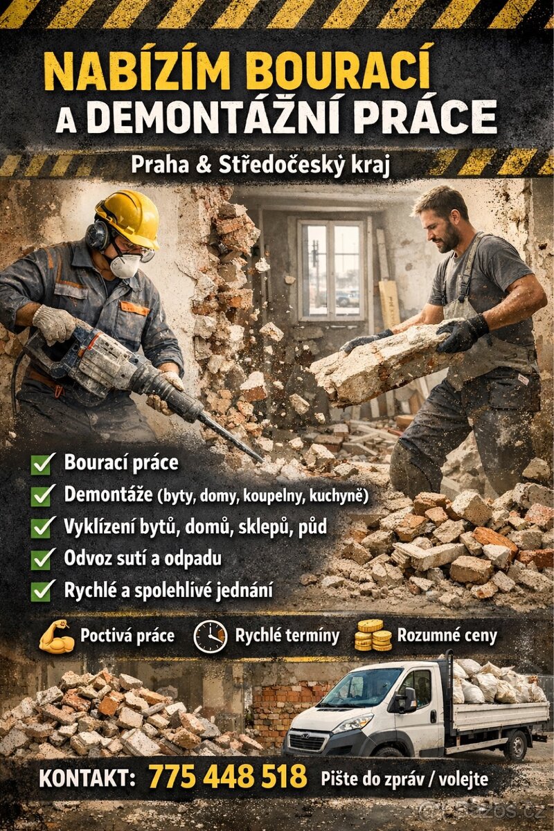 🔨 NABÍZÍM BOURACÍ A DEMONTÁŽNÍ PRÁCE 🔨 📍 Praha & Středočeský kraj ✅ bourací práce ✅ demontáže (byty, domy, koupelny, kuchyně) ✅ vyklízení bytů, domů, sklepů, půd ✅ odvoz suti a odpadu ✅ rychlé a spolehlivé jednání 💪 Poctivá práce ⏱️ Rychlé termíny 💰 Rozumné ceny 📩 Pište do zpráv / volejte