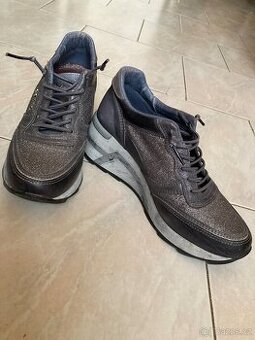 Prodám dámské vycházkové boty zn. Cetti, vel. 41, barva šedá zdobená stříbrnými střípky, pružné tkaničky, vysoká podrážka, v patní části 6cm, kožená vnitřní stélka, délka stélky 26 cm. Pohodlné, minimálně nošené.