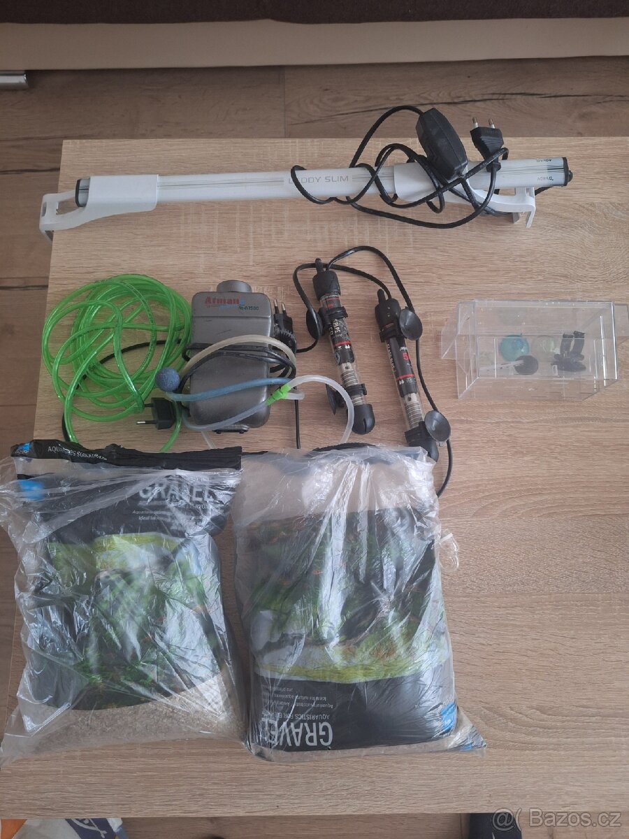 6kg štěrku Porodnička CO2 difuzer Topítko 50W Světlo LeddySlim 10W 50-70cm Vzduchový motorek Atman AP7500 Cena 500Kč za vše