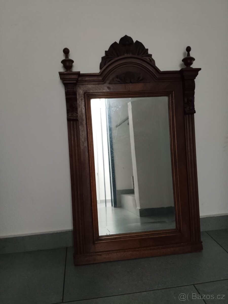 Na prodej starožitné zrcadlo z ořechového dřeva ve stylu Biedermeier. Rozměry: šířka 50 cm, výška 80 cm, hloubka 3-7 cm.