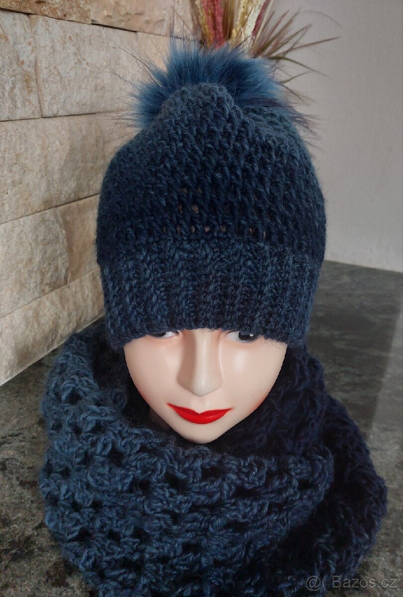 Ručně háčkovaný set, čepice s velkou bambulí a dlouhou šálou.