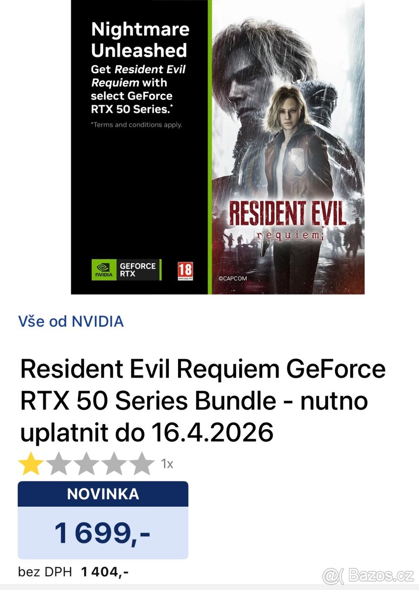 Prodám elektronický klič ke hře Resident Evil Requiem GeForce RTX 50 Series Bundle - nutno uplatnit do 16.4.2026 Více info viz foto
