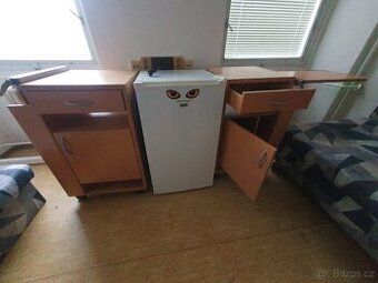 Prodám: noční stolek na kolečkách v imitaci třešně - 15 ks - sklopný stolek k posteli - zásuvka - dvířka šířka 44cm hloubka 45cm výška desky 83cm výška celková cca 112cm CENA 500 Kč / ks při odběru 10 ks, cena 300Kč/ks.