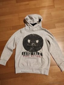 Nabízím k prodeji dětskou mikinu s kapucí ve velikosti 134/140 v přední části je potisk smajlíka a zip, který slouží jako kapsička. Celková délka mikiny je 56 cm šířka 40 cm délka rukávů měřeno i s ramenem je 67 cm pěkná možnost i osobního odběru nebo se podívejte na mé další inzeráty sjednotím poštovné. Cena mikiny 75