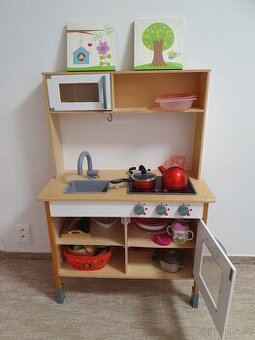 Dřevěná kuchyňka s příslušenstvím. Sporák svítí a vydává zvuky. Nastavitelná výška nožiček. Stav: Kuchyňce vypadla levá dvířka, dvířka přidám. Příslušenství: Nerezové nádobí, červené nádobí, příbory nerezové a příbory dřevěné, koš s plastovým ovocem, koš s textilním ovocem Ikea, textilní hamburger, dort dřevěný se svíčkami, dřevěné ovoce + zelenina s dřevěným nožem "na krájení" Výbava v příslušenství nemusí být kompletní Edit: po nafocení jsem našla a dodala nějaké příslušenství