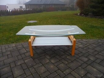 stůl konferenční, skleněná deska, dřevěné nohy,