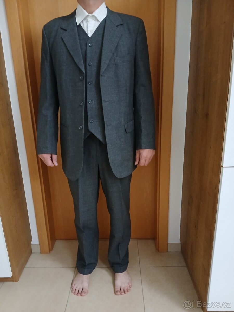 Prodám šedý oblek s vestou na postavu cca 184cm. Velikost saka 54, Kalhoty 50
