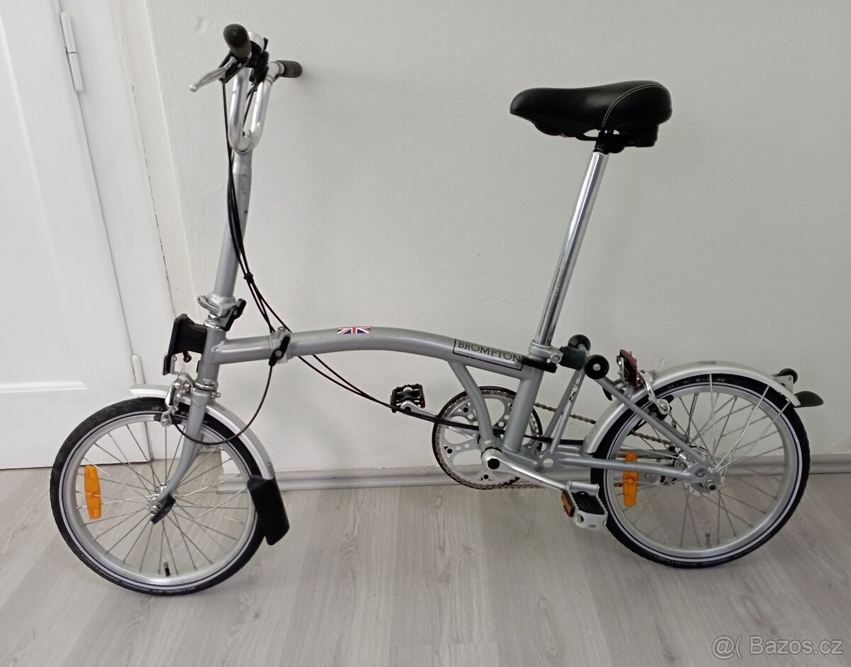 Skládací kolo Brompton, vše originální, pouze sedlo vyměněno za typ s regulovanou tvrdostí pomocí vestavěné pumpičky. Plně funkční, výborný stav.
