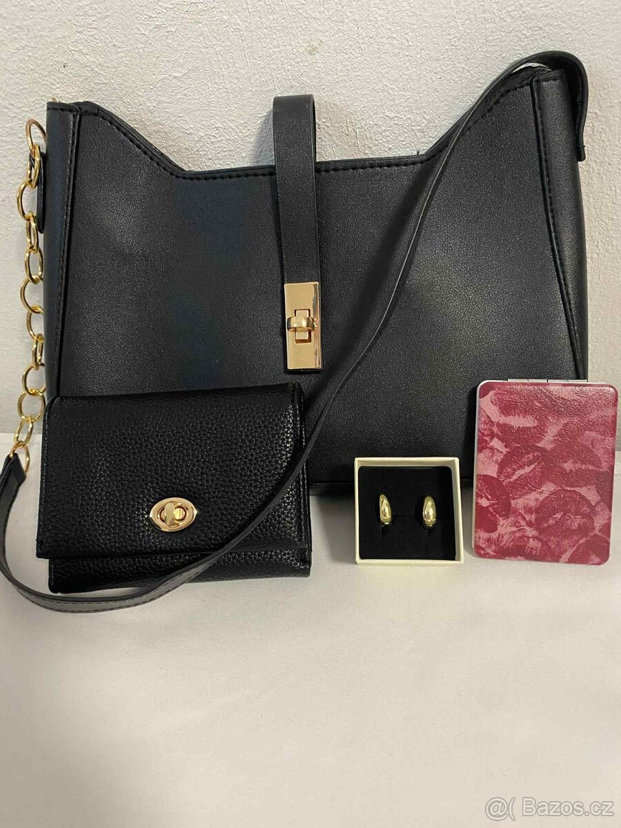 🖤 Elegantní dámský set – kabelka, peněženka, náušnice, zrcátko Nabízím stylový dámský set v černé barvě, vhodný ke společenskému i běžnému nošení. Součást setu: 👜 kabelka – materiál PU (umělá kůže), zlaté detaily 👛 peněženka – umělá kůže 💍 náušnice – bižuterie 🪞 malé zrcátko 📏 Rozměry: Peněženka : Šířka : 12cm , Výška : 9cm Kabelka : Šířka : 26cm , Výška : 15 cm Set je nový, nepoužitý, pěkné zpracování Peněženka na dotek velmi jemná k nepoznání od kožené