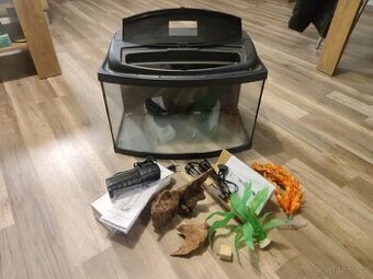 Prodám starší akvárium s úplně novým filtrem i topením. Filtr a topení nebyly nikdy použity dále přidám kořeny a umělé kytky a vzduchovací kámen. Akvárium neteče ale za ty roky už má rýhy na předním skle ale jen ve spodní části u dna. V plastovém krytu kdysi odešla zářivka vyřešeno žárovkou. Akvárium bylo využíváno i jako terárium pro křečka.