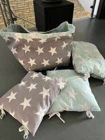 Prodávám použitý set vaku na hračku a polštářků, stále v pěkném stavu. Polštářky mají všechny po stranách zavazovací šňůrky (sloužily jako mantinel do postýlky). Vak na hračky je dostatečně velký a je oboustranný. Jeden menší a obdélníkový polštář je také oboustranný. Z jedné strany tyrkysové hvězdičky, z druhé šedé. Šité na míru. Možnost osobního odběru Šlapanice u Brna nebo zásilkovnou/kurýrem.
