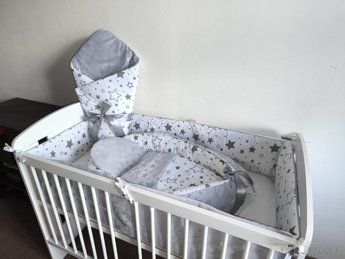 Nová souprava do postýlky se skládá z hnízdečka, rychlozavinovačky, mantinelu kolem celé postýlky a dečky s polštářkem na zakrytí v hnízdečku. Vše je ušité z kvalitní 100% bavlny v kombinaci s minky s vytlačenými hvězdičkami. Souprava je vzhledem k neutrálním a pastelovým barvičkám vhodná pro holčičky i chlapečky. Možnosti doručení: - balíkovna - 75Kč - zásilkovna - 89Kč - doručení na adresu - 109Kč - osobní odběr v Krnově, po domluvě v Opavě