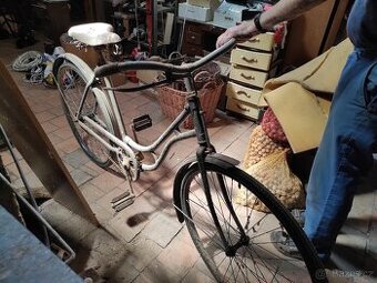 Cena: Nabídněte. Nabízím historické kolo. Kolo nemá štítek a tak je značka neznámá. Kolo má přední brzdu pomocí špalku na horní běhoun, nálezový stav, osobní odběr.