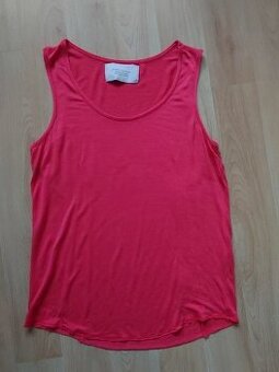 Tenké tílko, moc příjemné na nošení. Byť párkrát na sobě, má drobné vady - vypáral se 1 cm dolního lemu a má na sobě 3 malinkaté dírky (víceméně na jeden steh, půjdou velmi snadno zašít), obojí viz foto