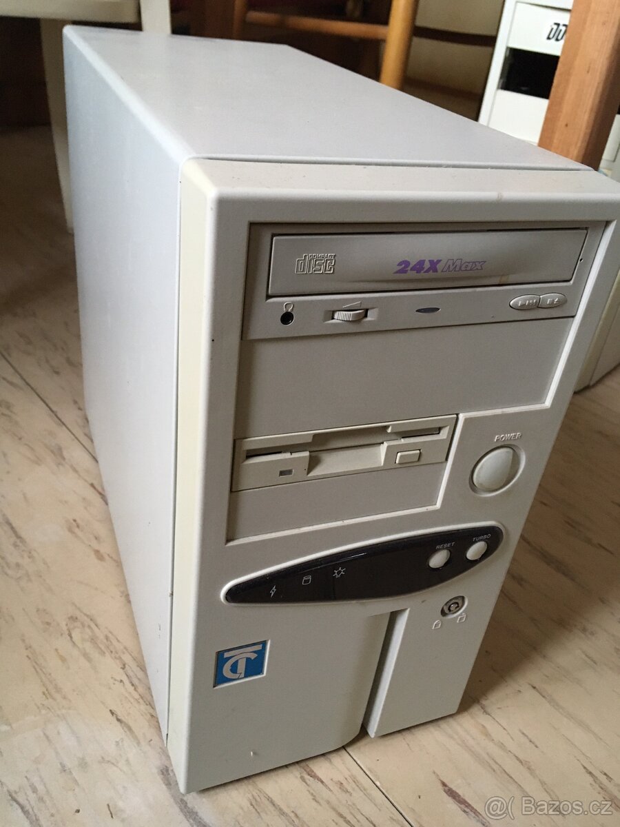 retro pc, Cyrix P166+MHz velmi hlučný jeden ventilátor, nabíhá do DamnSmall Linuxu, 2,5GB disk, 80MB RAM, disketovka, CDROM, síťovka, grafika, zvukovka, 3800,- retro klávesnice, Din 5Pin, se žlábkem na tušky, 500,-