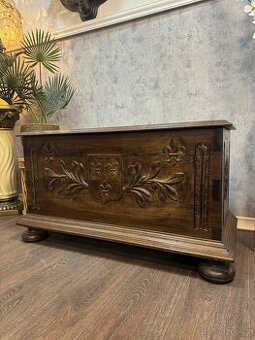 Šířka 104 cm, hloubka 48 cm, výška 57 cm. Elegantní a velmi dekorativní starožitná truhla z masivního dubu, provedená v historizujícím stylu. Čelní stranu zdobí bohatá ruční řezba s rostlinnými motivy a heraldickým štítem s liliemi (fleur-de-lis), které truhle dodávají výrazný aristokratický charakter. Osobní odběr a doprava: Preferujeme osobní vyzvednutí. Nabízíme rozvoz po celé ČR i do zahraničí 12 Kč/km (počítá se celá trasa, tam i zpět). Při zájmu více zákazníků v jednom směru je možné využít sdílenou dopravu. Je možné se domluvit také na zaslání přes TOPTRANS nebo Českou poštu, ale upozorňujeme, že doručení může trvat i 14 dní. Podmínky prodeje: Jedná se o starožitné/použité zboží, které může nést známky opotřebení. Stav odpovídá fotografiím. Osobní prohlídka možná po domluvě. Vrácení není možné, nabízíme však výměnu za jiný kus stejné nebo vyšší hodnoty (s případným doplatkem). Doklad o koupi na vyžádání (vše evidujeme pro DP).
