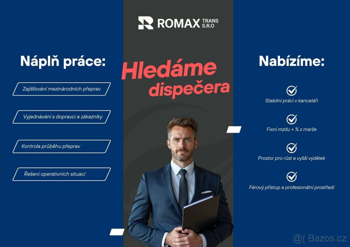 🚛 Romax Trans hledá nového kolegu na pozici Dispečer nákladní dopravy v Praze! Máš rád(a) pořádek, rychlá rozhodnutí a práci kde se každý den něco děje? Pak čti dál. Co tě čeká: 🔹 Plánování a koordinace tras kamionů 🔹 Komunikace s řidiči, dopravci a zákazníky 🔹 Sledování zásilek a operativní řešení situací 🔹 Vedení dokumentace a podpora týmu Co od tebe očekáváme: ▪️ Dobré komunikační dovednosti a angličtinu pro každodenní provoz ▪️ Pečlivost, zodpovědnost a chuť učit se novým věcem ▪️ Zkušenosti v logistice vítáme — ale nejsou podmínkou Co získáš: 🔸 Pracovní doba 8:00–17:00 🔸 Plat + 50 000 Kč 🔸 Přátelský tým a příjemnou atmosféru 🔸 Prostor pro profesní růst a kvalitní zaškolení 🔸 Multisport kartu 📩 Pošli nám své CV na [email protected] nebo volej +420774374070a staň se součástí Romax Trans!