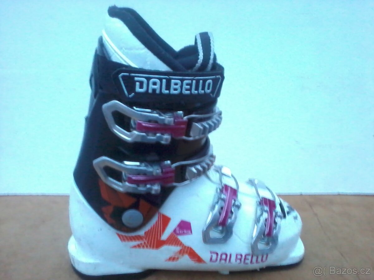 Prodám dívčí lyžáky zn. Dalbello 22,5 délka stélky 22,5 délka venkovní boty 269mm. Lyžáky mají 4x kovové přesky + utahovací pásek na suchý zip.