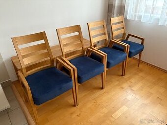 Prodám 4 ks jídelních židli/ křesel z masivu (dub). Židle jsou v truhlářství vyráběné na zakázku v roce 2022. Sedák je vyroben z dvouvrstvé pružinové matrace, tmavě modrý semiš je vysoce odolný oděru i světlu. Židle jsou nepoškozené. Šířka židlí je 51 cm. Cena za kus.